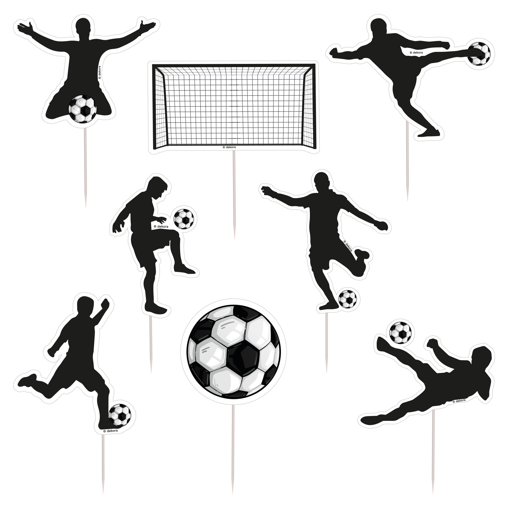 Hechos en papel resistente con palillo integrado, son fáciles de colocar y añaden un estilo encantador en segundos. ¡La forma más rápida de convertir una tarta común en una celebración futbolera!