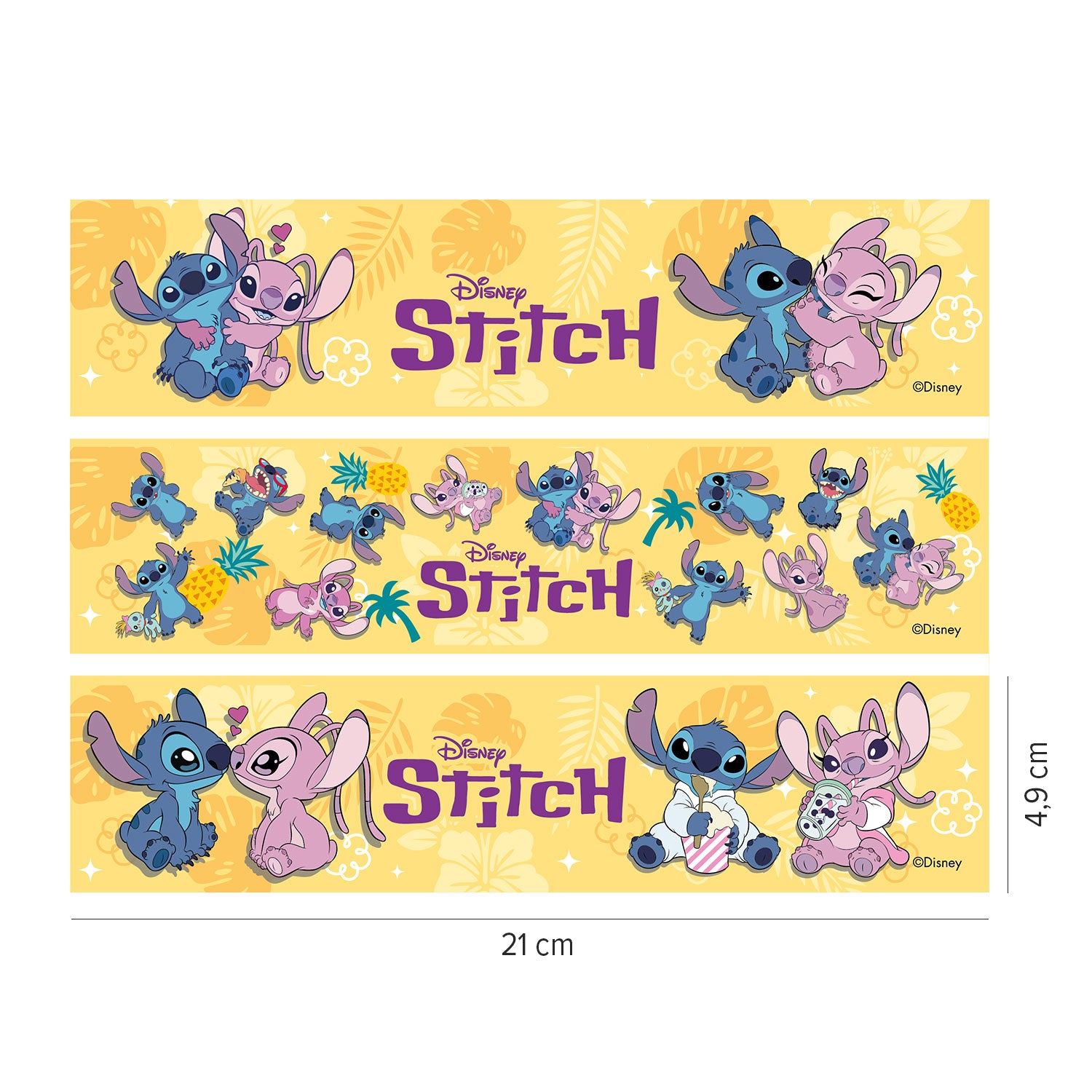 Ideal para fiestas temáticas de Lilo & Stitch, cumpleaños infantiles o eventos Disney, esta cinta se adapta perfectamente al contorno del pastel y es totalmente segura para el consumo.